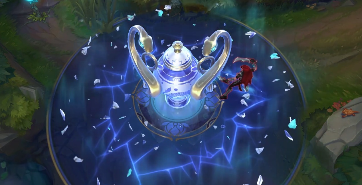 然后是丽桑卓的青花瓷皮肤,模型设计也非常好看,脚边是类似荷花花瓣式的设计,使用大招的时候,丽桑卓会化身一个巨大的青花瓷瓷器,然后会在周围有非常多碎裂的瓷器碎片粒子特效出现。