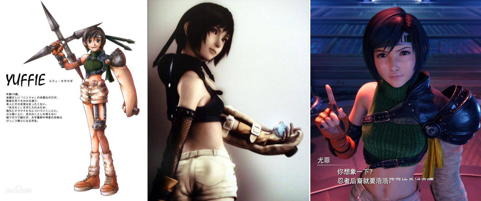 上方的对比图从左到右分别是(1)原版FF7的尤菲、(2)FF7地狱犬挽歌中的尤菲、(3)FF7重制版的尤菲,我们可以在上方的对比图中看出:重制版和原版的尤菲在服装是高度还原的,不同之处在于原版的画风更加偏“DQ”一点,而新版的画风则更加“FF”味。差别比较大是的地狱犬挽歌版尤菲,看起来更像是一个干练的忍者:皮质小坎肩+黑色内衬+皮质腰带军绿色热裤,在后来的电影《最终幻想7圣子降临》中的尤菲也是接近于这个造型。