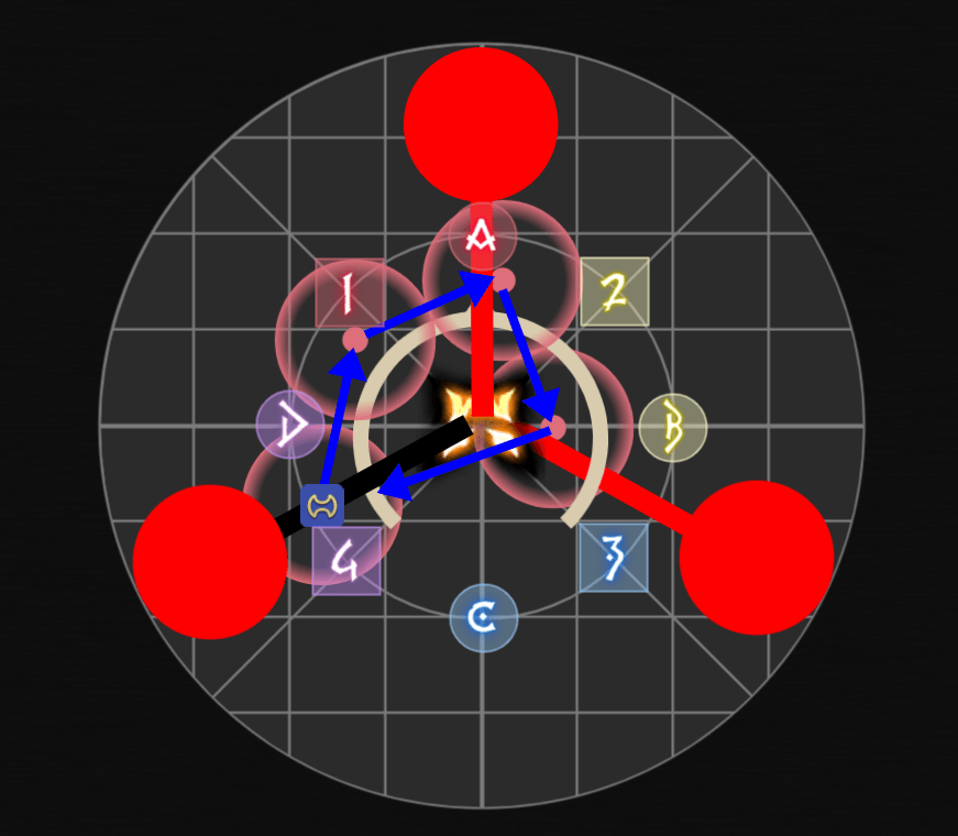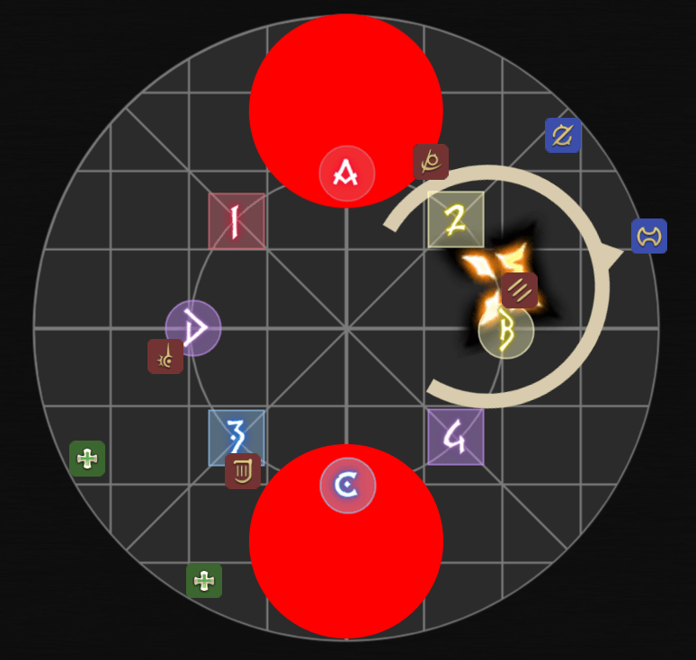 BOSS读条火龙卷时T组MTSTD1D3在A点集合,N组H1H2D2D4在C点集合准备进行第一次扇形三穿一。