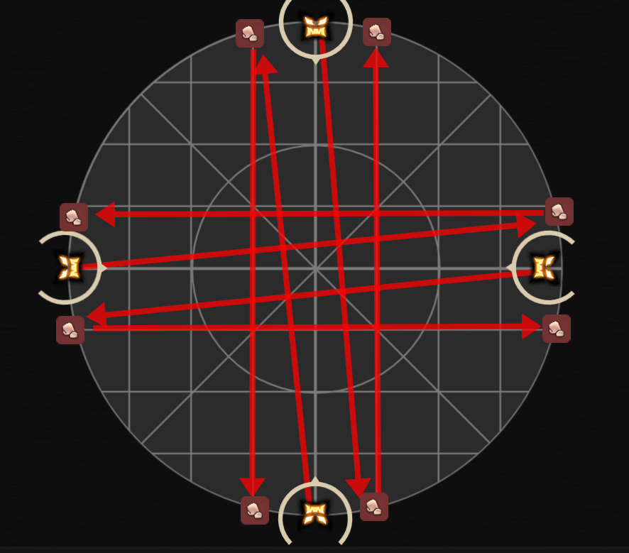 读条时除2个T在BOSS身下其他人先出BOSS目标圈。此时AC或者BD方向会连续顺时针出现4个灵泉。MTD1D3H1组负责A或B的灵泉,STD2D4H2组负责C或D的灵泉。奶妈需要贴场边连踩4个灵泉(灵泉为99%最大生命值的伤害,踩了灵泉会有治疗量提高的BUFF,灵泉没踩的话BOSS会有伤害提高=团灭)。