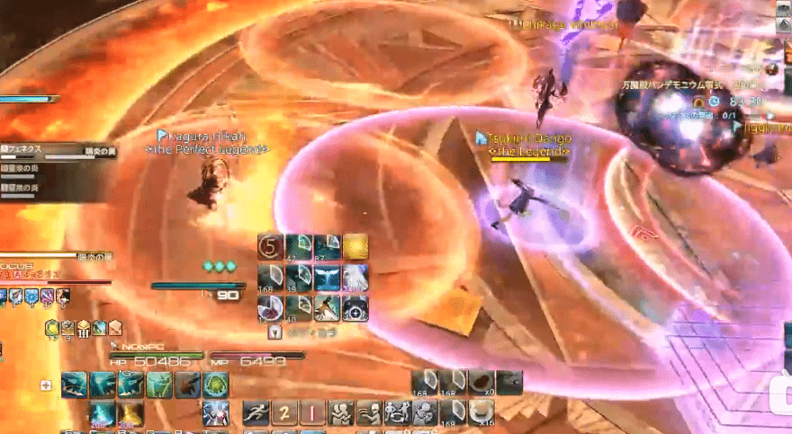 所有人会被点不同层数的死之超越,分别为1,2,4层。根据自己的层数如图所示站位不动即可处理,注意2层的要稍微走远一些,四下扇形结束后全员1血并有治疗量降低的debuff,回到场中刷血。此处占星可以用宏观宇宙一键解决,其他奶妈如果觉得吃力可以奶LB
