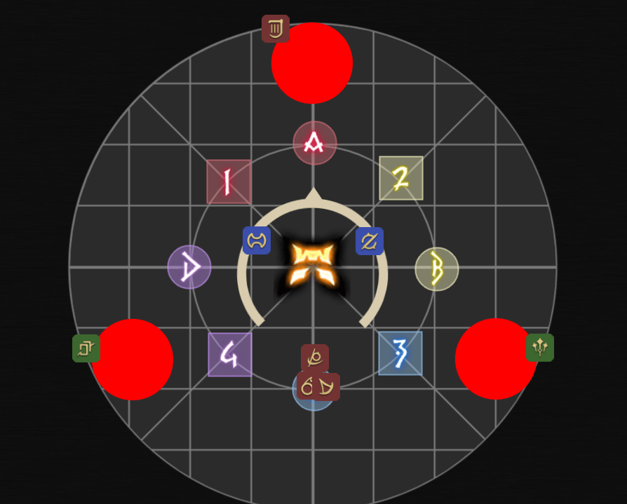 全体先在场中引导。如果是九连环,观察1和2标点方向,哪里炸了第一个地火就去哪边的十字走火安全区,去第一个炸的火的顺时针角落贴边(注意要靠近第二个炸的火一点)躲避九连环后,站在十字走火安全区的场边中线位置集合引导黄圈,黄圈出来躲开黄圈之后躲避boss读条左右刀。