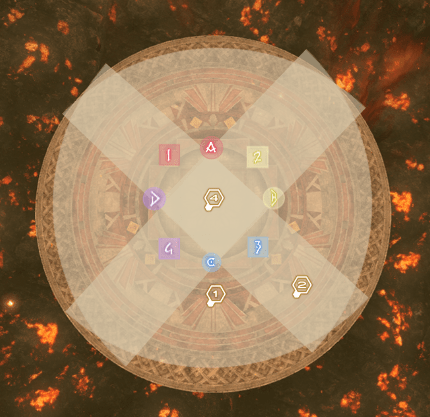 这里规定如果是8人分摊的话直接在九连环安全点分摊,如果是分散的话,MT和H2追着地火走到最远贴边,ST和H1在安全点方向贴边,D1和D3在安全点偏场内,D2和D4追着地火走到最远贴场中。图为假设九连环第一次爆炸区域为AC的情况。
