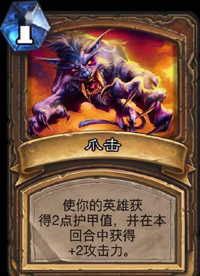 在7费有4张的情况下,就很需要一些小节奏,来润滑缝隙费用,爪击就是这样一张牌,前期可以解个飞刀、烈焰小鬼什么的,后期可以填补出质量生物后剩下的费用,特别是在打动物园的时候,频率是德劣势的一个重点,而爪击则可以缓解这一问题。