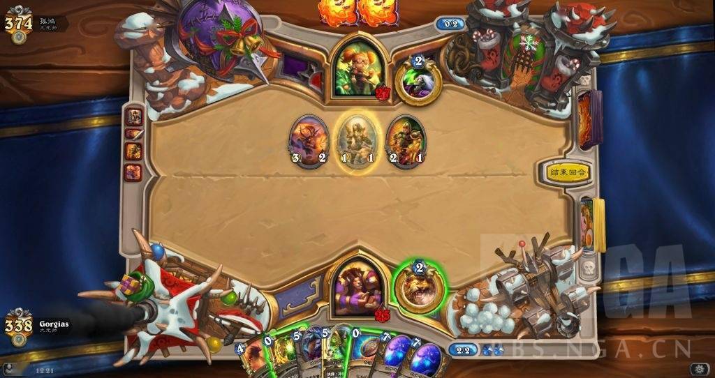 ——不应该,因为跳了5,3费没事做很亏节奏,而且如果被2-1叫嚣+魂火拆掉熊德会很亏,所以这里应该变脸解叫嚣。然后3费熊德,4费横扫,5费蓝龙,6、7费大树连拍,就赢了。