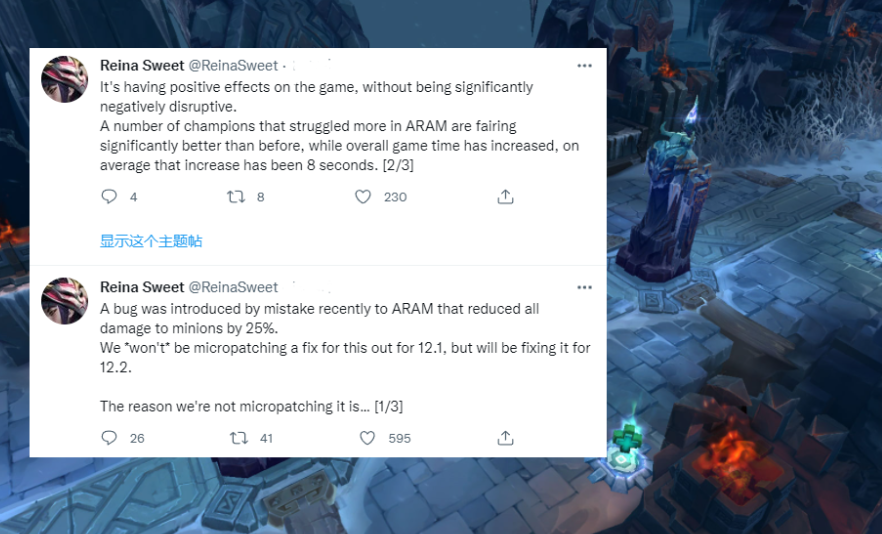对于这个BUG,设计师表示已经发现了,但是不打算使用热补丁进行修复,会在12.2版本中进行改动,因为小兵的这个BUG,对大乱斗的游戏节奏产生了积极的影响,而且设计师还考虑,在消除这个BUG之后选择用其他的方式来加强小兵。
