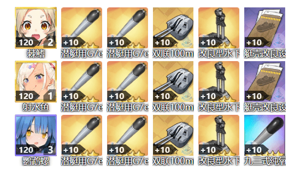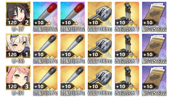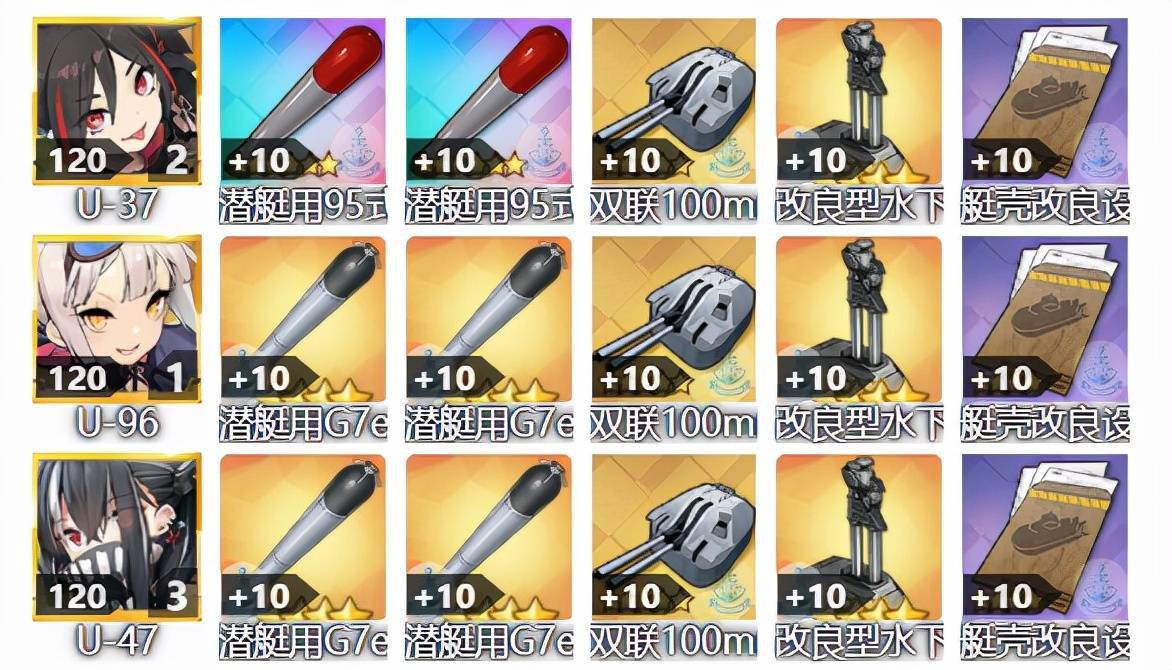 所以潜艇部分依旧优先推荐U系,输出依旧是主要追求。若无其中的鹦鹉螺或棘鳍可用U37替换,最后再考虑大青花鱼。