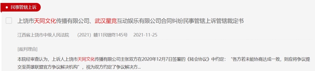 天同上诉的理由是认为地方法院,也就是江西省上饶市中级人民法院对本案没有管辖权,应该交由英雄联盟官方争议解决机构进行解决。