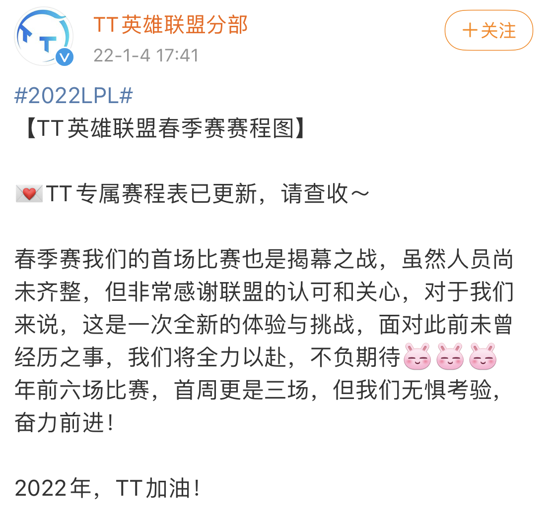 TT战队在得知新赛季赛程之后,官博曾经发过一篇微博,直接表示说目前人员尚未齐整,但非常感谢联盟的认可与关心,这里不禁让人读出了一丝辛酸的味道,因为这里官方给TT安排的赛程,明显有不合理的情况。