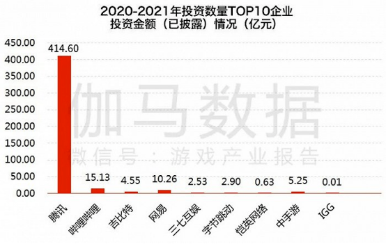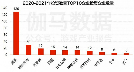 根据伽马数据近日发布的报告,在2020-2021年,腾讯共完成129起游戏方面的投资,高于其他9家企业投资数量的总和。