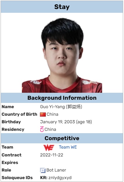 第二个18岁的选手是WE去年转会期抽的一张新卡,ID叫做Stay,在失去了Elk之后,WE战队必须要提前进入4.0的组建过程之中,在这里简单介绍一下Stay这个选手,他是从前年6月份开始打LDL的,是WE二队WEA战队的成员之一。