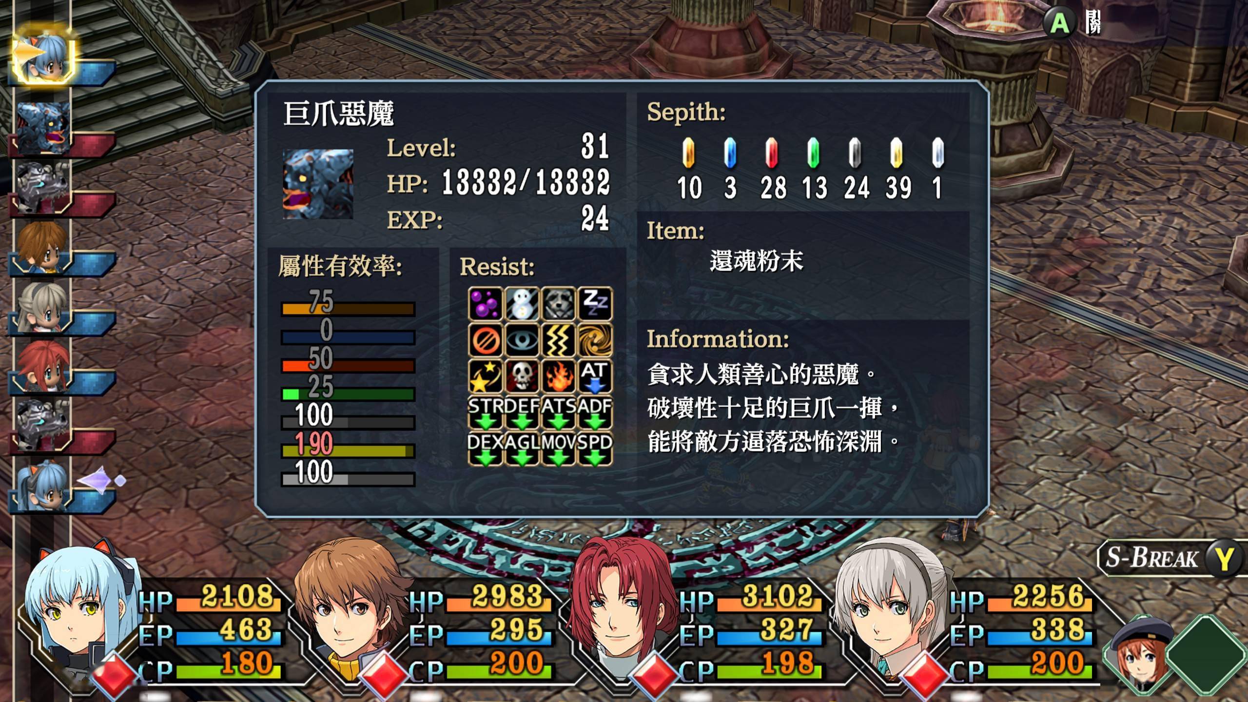 作为和后续作品的对比而言,《零之轨迹》中的战斗元素还是相对单调(其实艾丝蒂尔和约书亚在创轨中出场时,作为后续没有追加设定的NPC,这个问题体现的更为严重),基本上除了远古大型怪拉不动,具有“黑洞”效果的“黑暗物质”法术有了太高的重要性——在高难度战斗中,基本上缇欧先手黑暗物质,艾莉二发接一个拉人变成瞬发聚怪能让大量的战斗变的异常轻松。