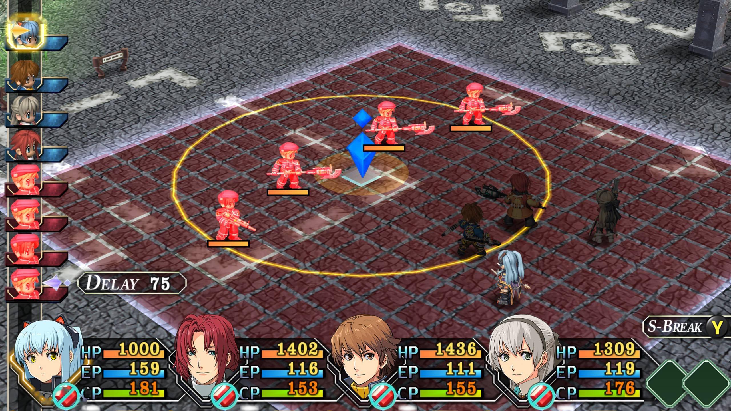 《零之轨迹》所使用的是带一定战棋要素的团队回合制战斗,战斗中的角色会根据速度的快慢执行自己的轮次,可以执行攻击&战技&S战技、魔法、移动或者使用物品,其中攻击&战技&S战技可以立即执行,魔法需要“驱动时间”,而上述所有行为都需要“僵直时间”,越强大的行动(比如S战技)所造成的僵直时间越长。