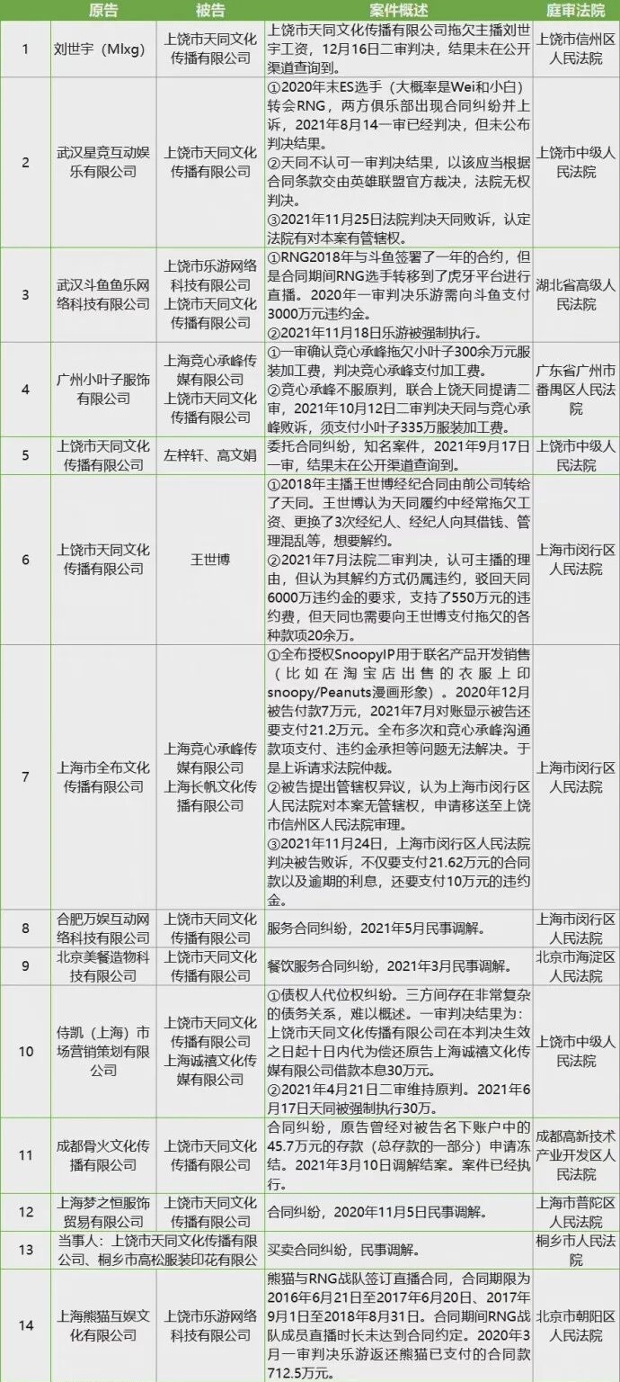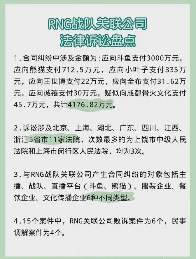 相信很多观众都知道了RNG关联公司和一些其他公司之间的官司进程,基本上都是比较能明确判决结果的官司,RNG关联公司违约,法院做出一审判决。