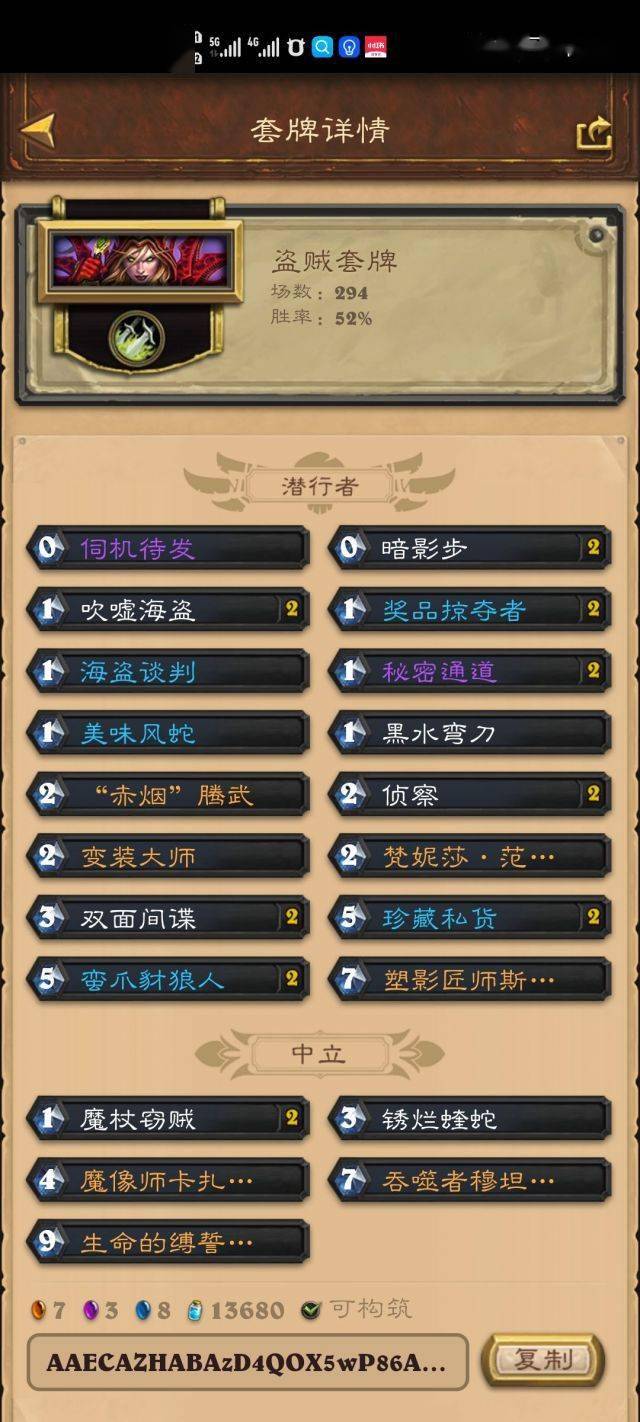 我从12月25号开始抄了论坛里一套剽窃贼,玩了5把以后发现终结比赛能力太差,就把一张海盗刀换成了红龙,至今打了快300把了,从胜率可以看出来,和天梯1000名开外各种主流卡组55开,上传肯定理论上是没问题,脸好一波连胜就够了,不过我是没那个脸,好几次一波连败俯冲。