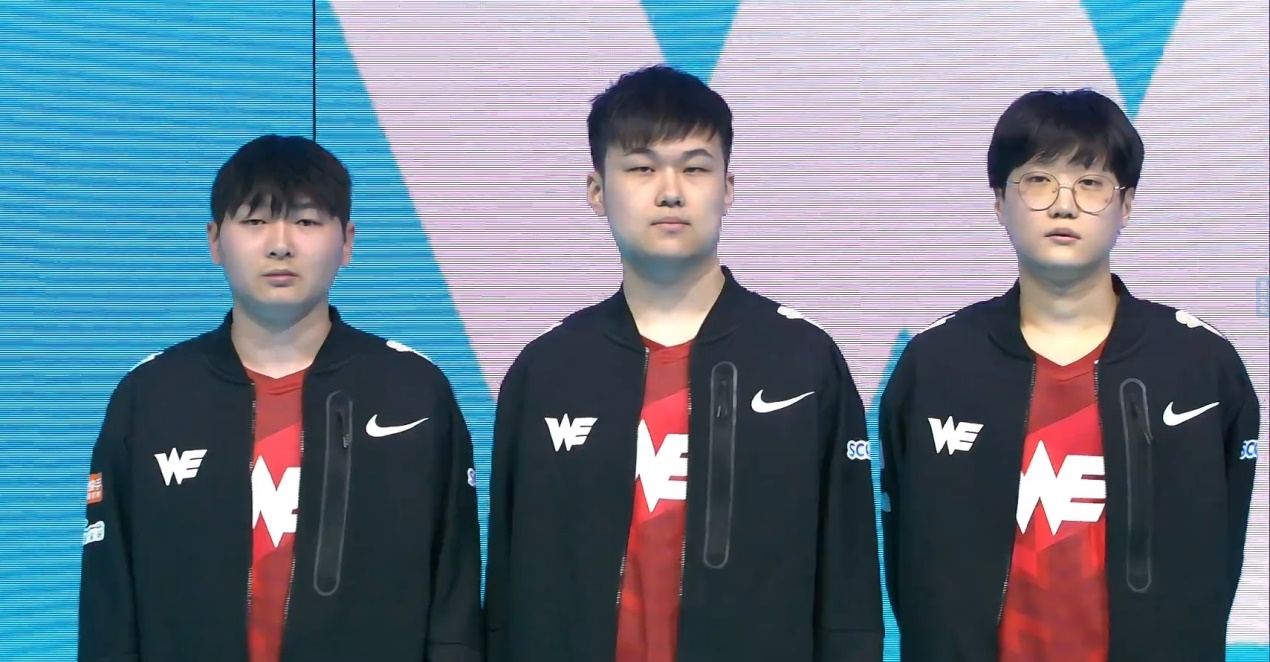 双方第一场比赛的BP阶段,WE战队在蓝色方是先抢掉了金克丝,搭配了标准的开团搭档赵信和洛,二轮中锁定飞机中单和上单鳄鱼,这是LPL最近非常流行的一套双Poke体系阵容,而且鳄鱼这个英雄罕见被放出来,中期也有比较强的作战能力。