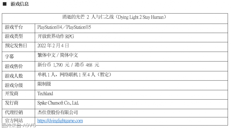 Spike Chunsoft Co., Ltd.将于2022年2月4日,在PlayStation 4以及PlayStation 5平台上,推出开放世界动作RPG《Dying Light 2 Stay Human(消逝的光芒2 人与仁之战)》中文版。本作于今日释出了电影风格情境短片,揭露在本作故事舞台「城寨」中残忍无情的生活与游戏世界观。