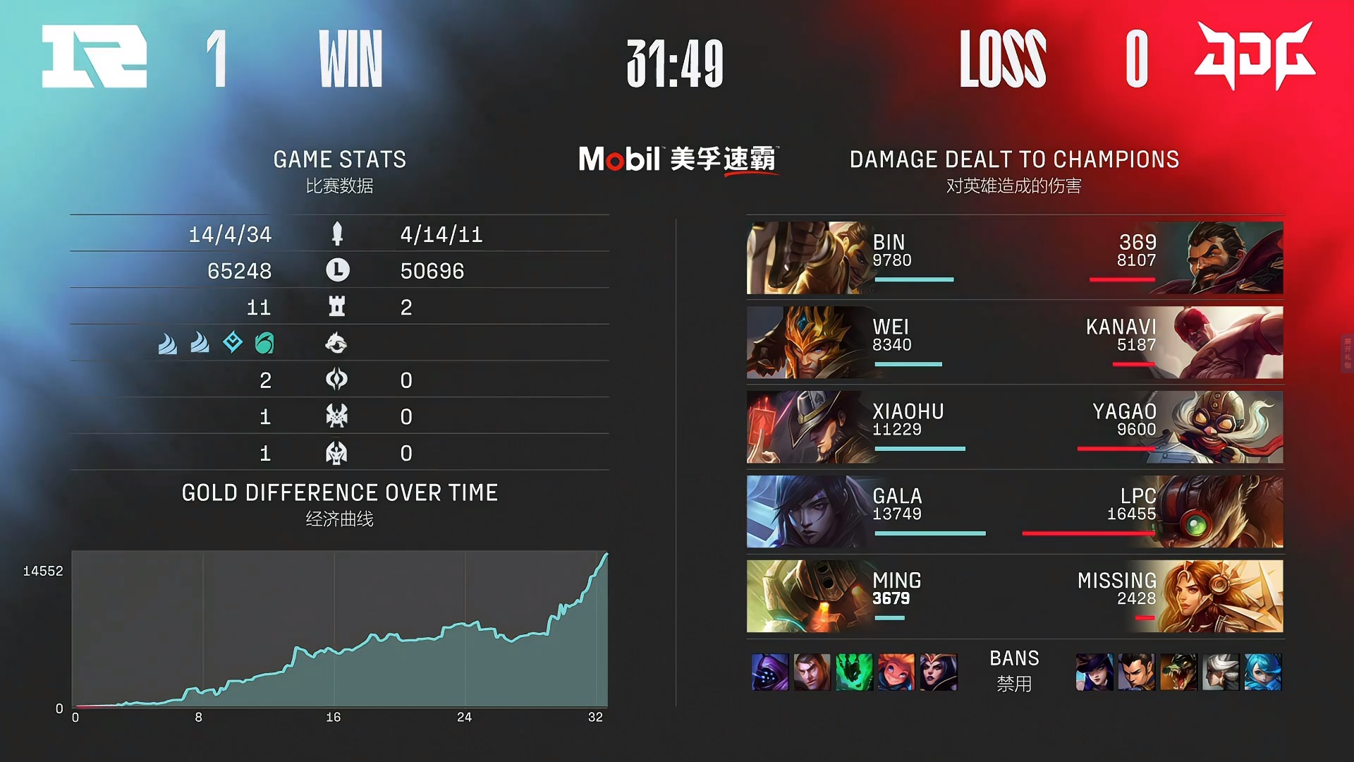 28分钟最重要的远古龙争夺中,JDG落位太慢,RNG直接快速Rush成功拿下,并且击杀了辅助,随后又拿下大龙BUFF,此时比赛已经失去悬念,RNG顺利地拿下比赛胜利。