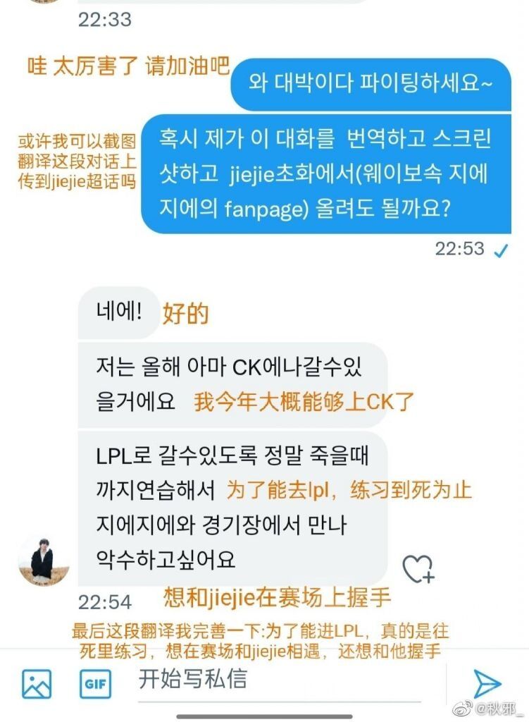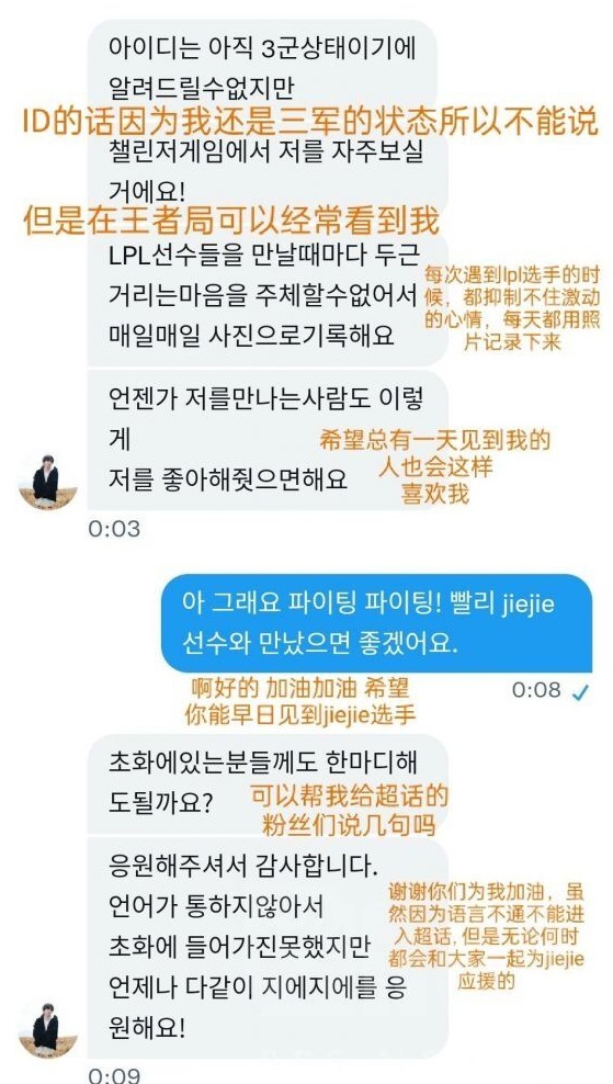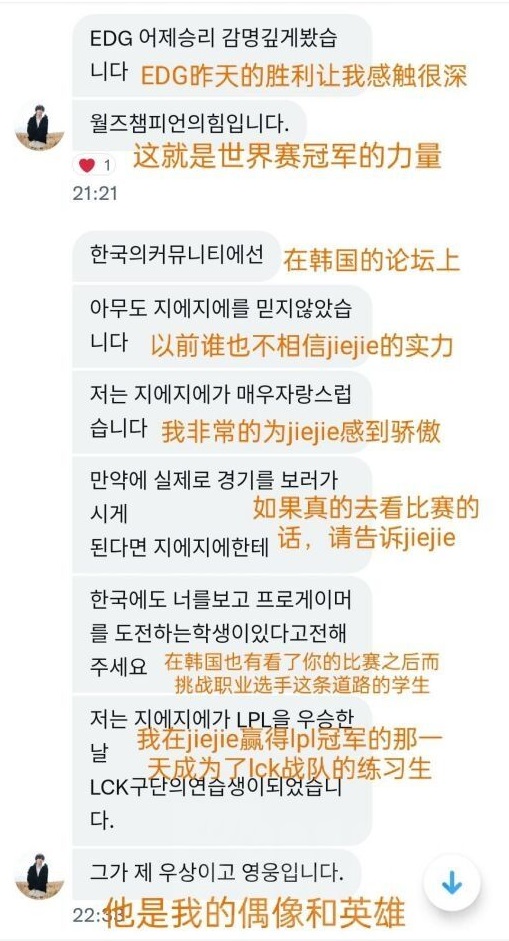 这位韩国玩家视Jiejie为英雄和偶像,原因是因为Jiejie去年的经历鼓舞到了他,他自己表示说在韩国论坛上,几乎没有人看好Jiejie这个选手,去年一整年都是这样,但是Jiejie却完成了觉醒,在夏季赛和世界赛上爆发拿下了世界冠军。