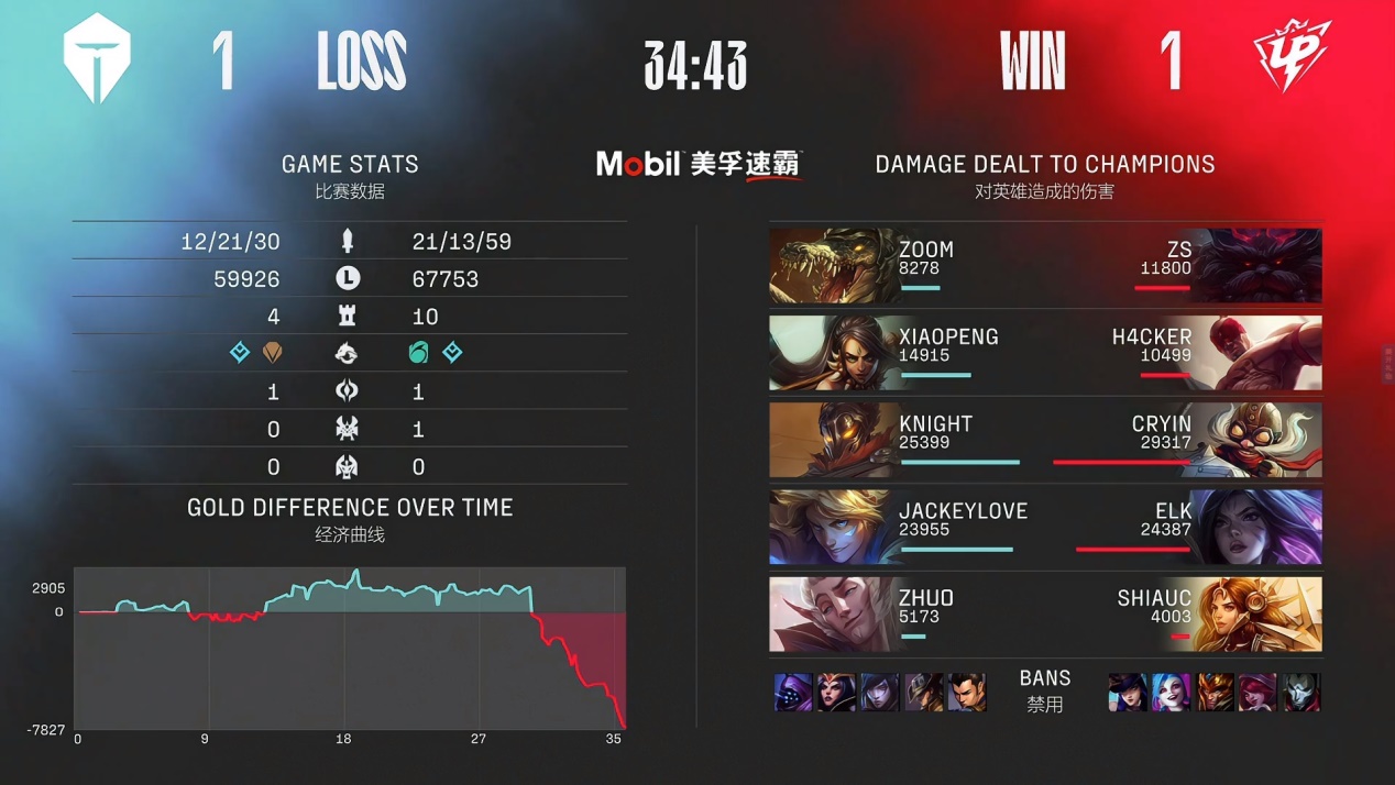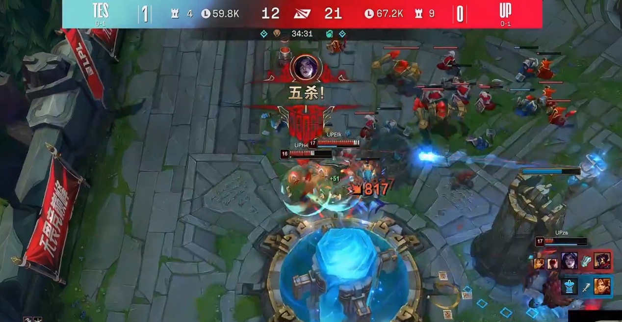 总结本场比赛的一个进程,JKL在前期死亡过多成为了一个伏笔,中期TES战队其实是占据主动和经济优势的,但是关键局面下的团队决策或者说Zoom出现致命失误,海克斯传送门送掉人头后,正面也被UP击溃,导致局势一下子就崩了。