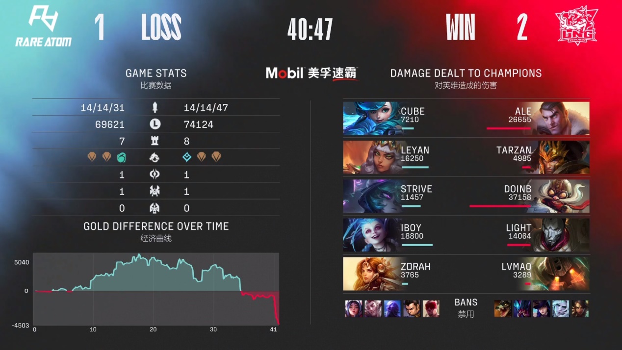 简单说一下第三场决胜局的情况,RA战队在这场比赛的前期优势比较大,中期最大优势的时候有5千多,而LNG战队在中期是拿了一些战略点的经济回来,并且也拿到了一些ShutDown的大人头。