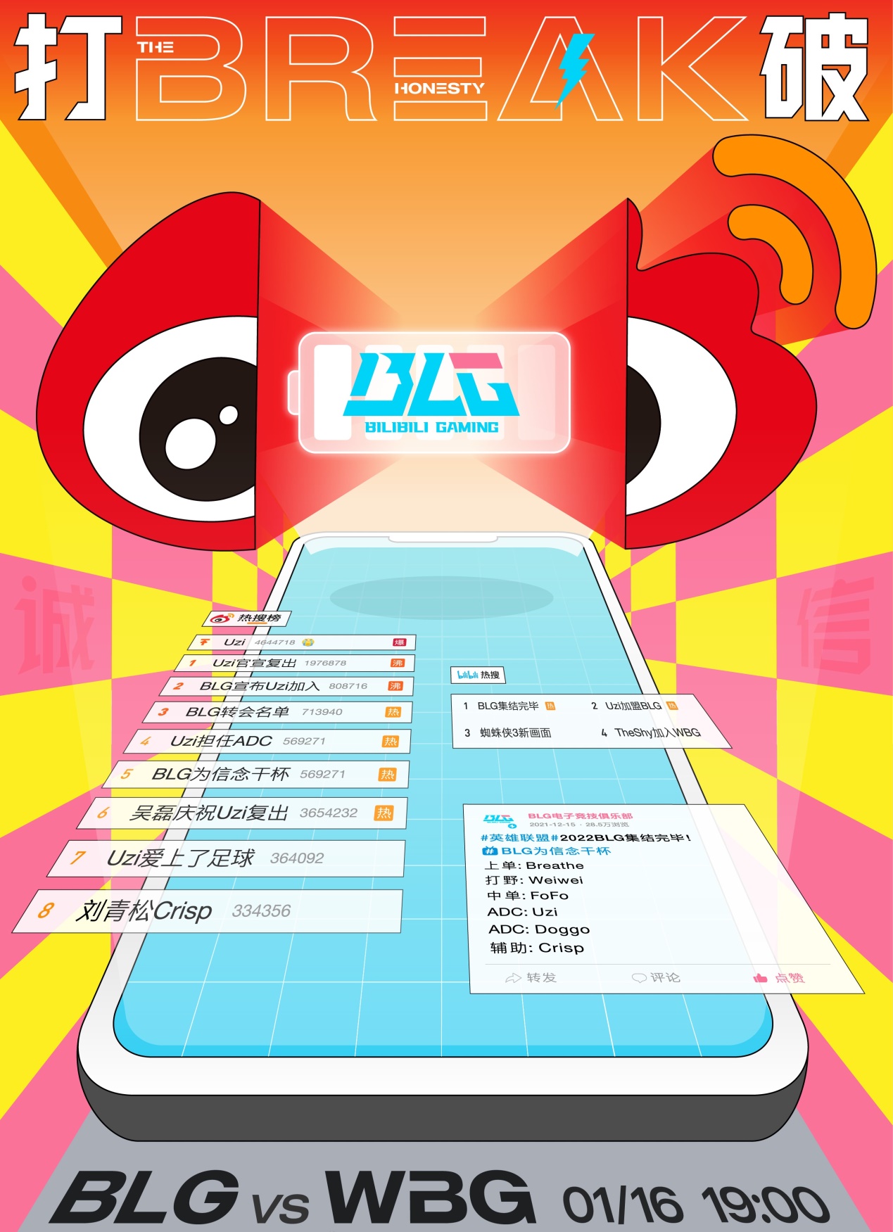 第二个让观众不满的点就是BLG战队的赛前海报,上面有很多有趣的梗,BLG打微博,上面出现了非常多的关于Uzi的热搜词条,看到这里以为Uzi肯定上了。