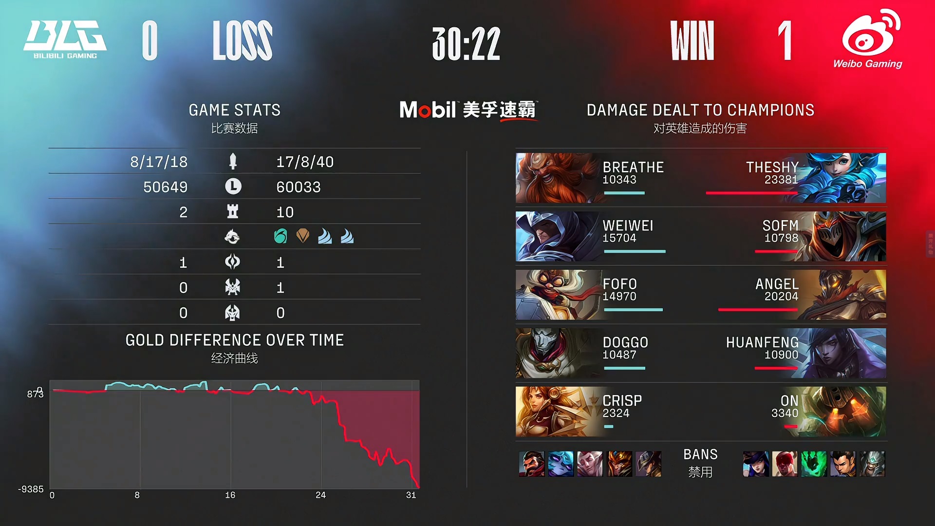 陷入劣势后BLG战队开始主动找机会,是成功击杀了对方的SofM,但是The Shy上路随后直接杀疯了,一波配合队友击杀对方四人,WBG战队直接拆掉中路高地,此后双方再次展开团战,BLG又一次被正面干碎,比赛一波结束被推平。