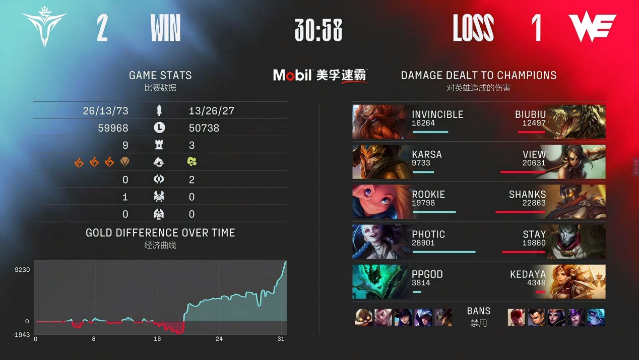 这场比赛Rookie使用薇古丝,一直在找机会帮助队友,浪费了很多自己的发育,最后也没能拿下比赛的胜利。