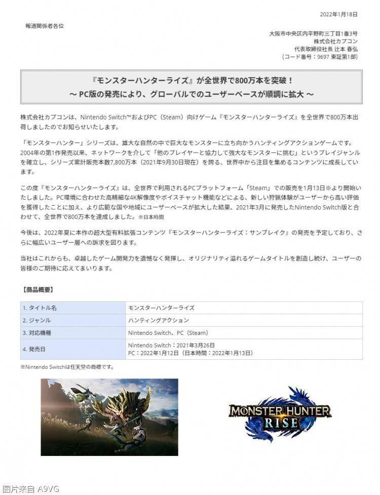 原标题:《怪物猎人 崛起》全球出货量突破800万份