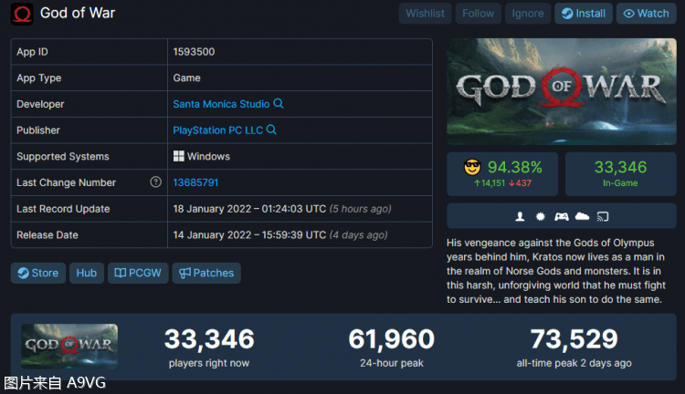 SteamDB显示《战神》PC版发售后,同时在线玩家峰值达到73,529人,创造近期PlayStation第一方作品在PC上的最佳首发表现。《地平线:零之曙光》的峰值人数为56,557人,《往日不再》为27,450人。