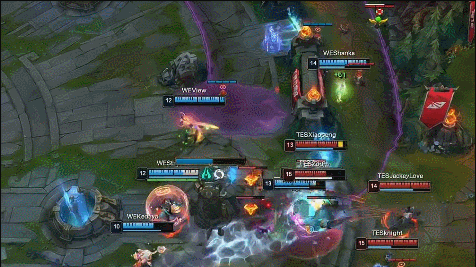 大龙BUFF推进过程中,TES战队转线拆上路,过程中WE抓住机会先击杀泰坦,但是维克托大招把所有人打残,后续TES追击击杀酒桶,直接上高地。
