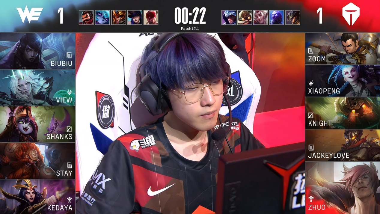 峡谷先锋刷新之前,Knight维克托在中路出现走位靠前的失误,在已知对方没有在打峡谷先锋的情况下给了机会,WE集结众人之力击杀Knight并且拿下峡谷先锋。