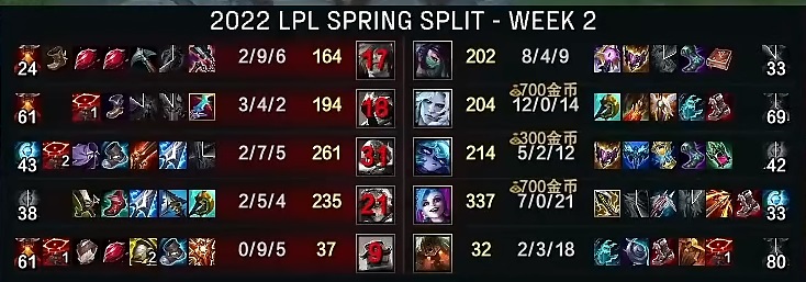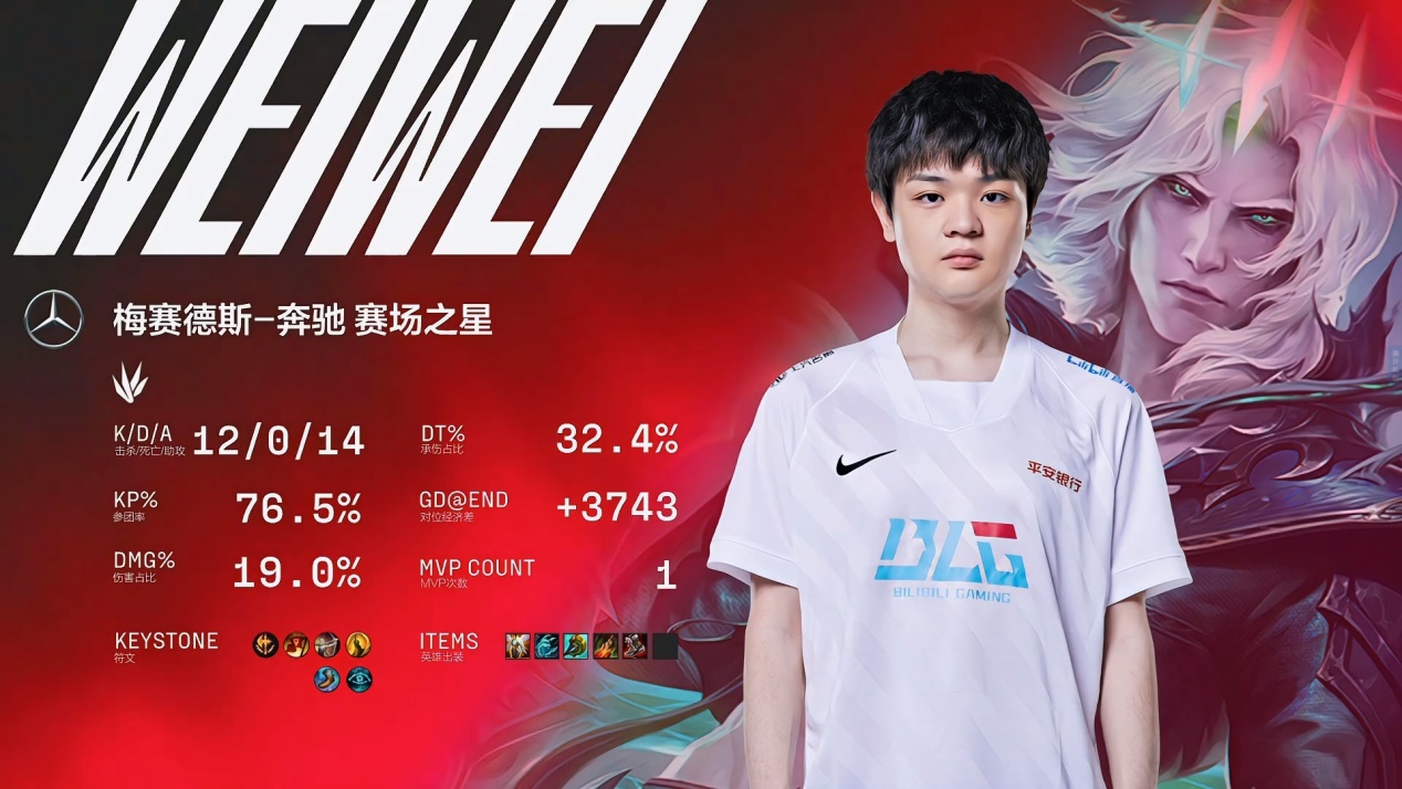 反而BLG战队这边,因为这场数据全都刷满了,因此很有机会锁定第二周的最佳阵容,其中数据最豪华的莫过于打野位的Weiwei,在本场比赛中Weiwei的数据为12-0-14。