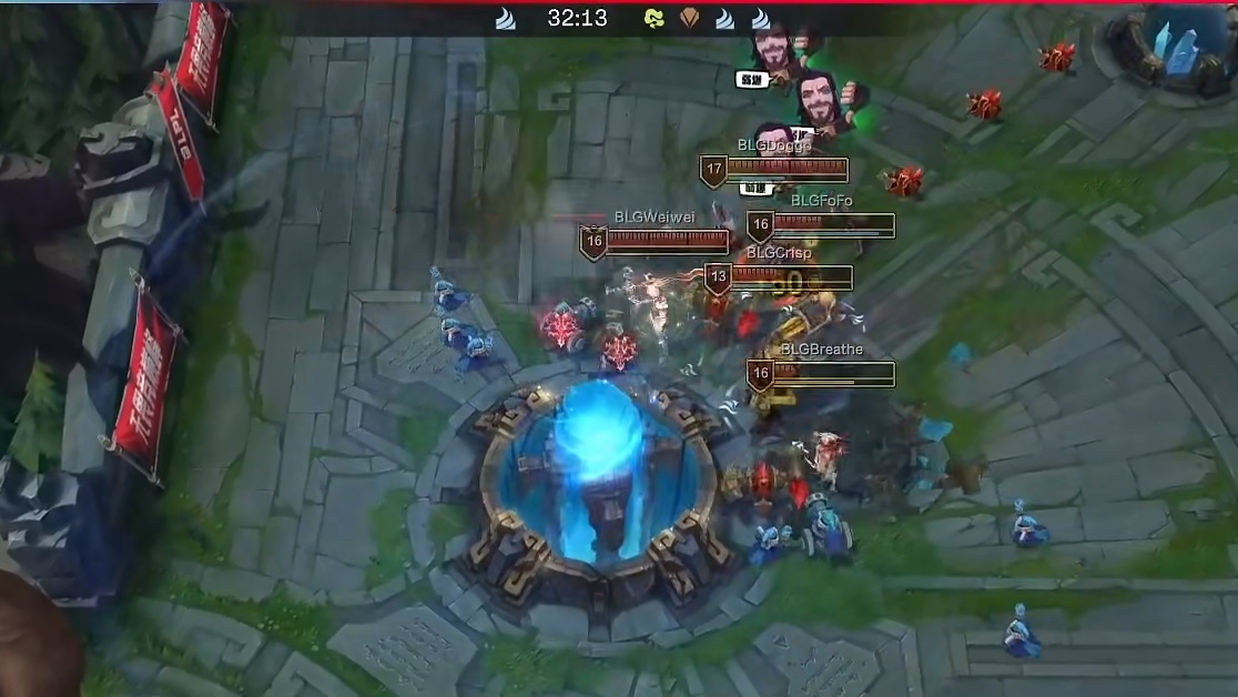 本场比赛BLG战队是疯狂地与OMG打团,Crisp泰坦的钩子开团几乎百发百中,团战开起来之后,BLG的选手就是不要命地往里冲,薇古丝阿卡丽与佛耶戈冲阵,金克丝收割。