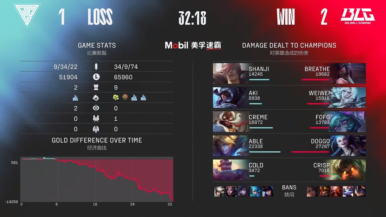 站在观众的视角就看到BLG战队计分板上的人头数蹭蹭往上涨,而OMG这边的人头数到最后也没超过10个,最终BLG战队单场是打出了34-9的人头比,用时32分钟终结了比赛,OMG这场可以说是输得心服口服了。