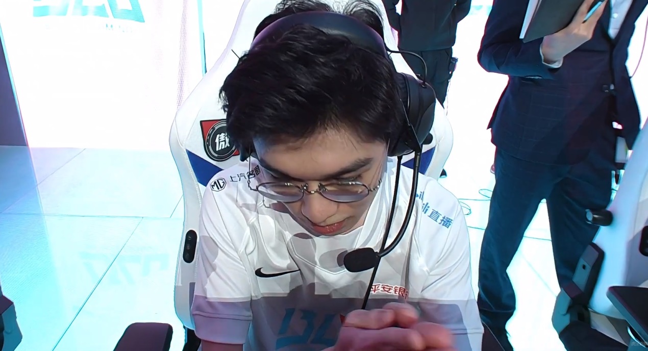 OMG战队这场选出的阵容是瑟提、男刀、飞机、EZ和布隆,布隆一手防你冲阵,结果比较惨,没有防住,BLG的进攻实在是太猛了。