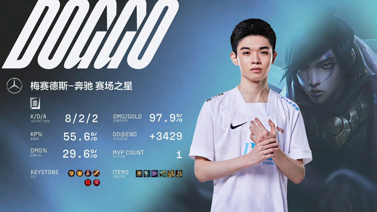 BLG第一场对阵WBG的比赛中,也是完成了让一追二,在那一轮BO3的比赛里面Doggo是出现了一些比较离谱的失误,第三局Doggo有两波罕见的失误操作,一波在中路逗留被直接留下击杀,一波大优势传送高地送掉人头。