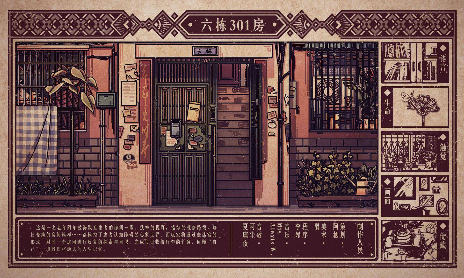 《6栋301房》是由帧间工作室开发的一款休闲解谜游戏,游戏通过独特的视角展现出一名老年阿尔茨海默病患者的日常生活。玩家将设身处地体验阿尔茨海默病患者所面临的困境,感受他们眼中的世界。《6栋301房》也是Gamera Game此前公布的“叶绿素计划”中的作品之一,预计将于2022年内发售。