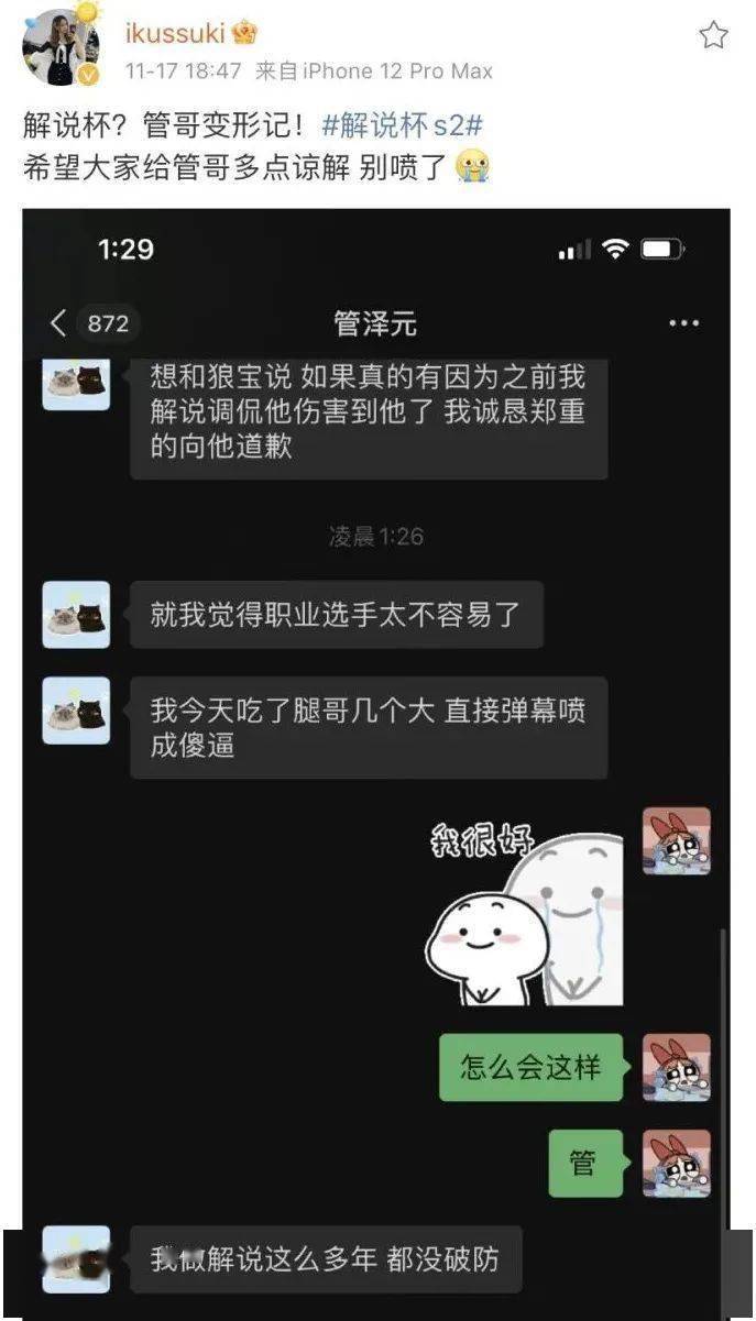 可以说这个赛季的管泽元解说和之前他的风格相比似乎更放飞自我了,但需要注意的是,泽元在去年年底的解说杯中,因为过于内卷,战队被淘汰,自己表现不好后直接破防了,然后在聊天记录中给狼行道歉。