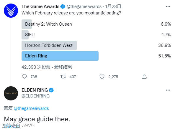 TGA官方进行了2月最期待游戏投票,《艾尔登法环》以51.5%的得票率位居第一,官推发文表示“愿赐福指引你”。第二为36.9%的《地平线 西之绝境》,《命运2:邪姬魅影》和《师父》分别得票6.9%和4.7%。