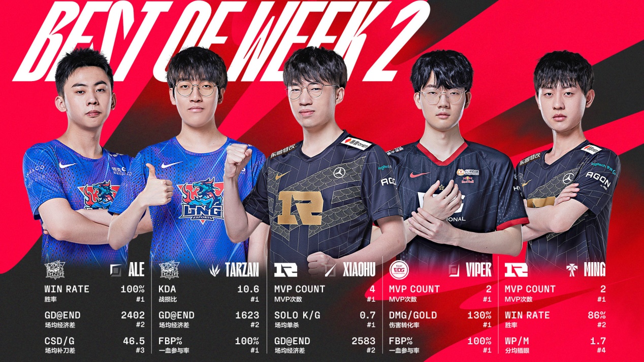 然后是第二周的最佳阵容(第一周最佳阵容的名单是Shanji、Tarzan、Crème、Viper和Meiko),而第二周中,Tarzan选手和Viper选手再次入选,此两位韩援保持了相当出色且稳定的状态。