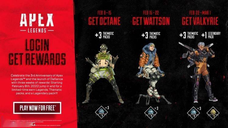 重生宣布为迎接《Apex英雄》三周年,官方将推出一系列登陆奖励活动,在活动期间内登陆游戏即可获得传奇、主题组合包以及传说级组合包。以下是具体信息: