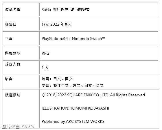 《SaGa 绯红恩典 绯色的野望》繁体中文版是将SQUARE ENIX的代表RPG作品之一《SaGa》系列的2016年新作《SaGa 绯红恩典》 追加了剧情与角色、语音、BGM等多种新元素,升级为能在 PlayStation%uAE4与Nintendo Switch™ 等 5 种平台游玩,並於2018年8月上市的作品。亚克系统亚洲分店预定将在 2022 年春天推出繁体中文版。