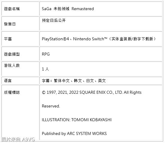 亚克系统(ARC SYSTEM WORKS)亚洲分店宣布,SQUARE ENIX CO., LTD.的RPG《SaGa 绯红恩典 绯色的野望》PlayStation%uAE4和Nintendo Switch™官方繁体中文实体盒装及数字下载版预计将于 2022 年春天上市。另外,也宣布了《SaGa 未拓领域 Remastered》确定制作官方繁体中文版的消息。