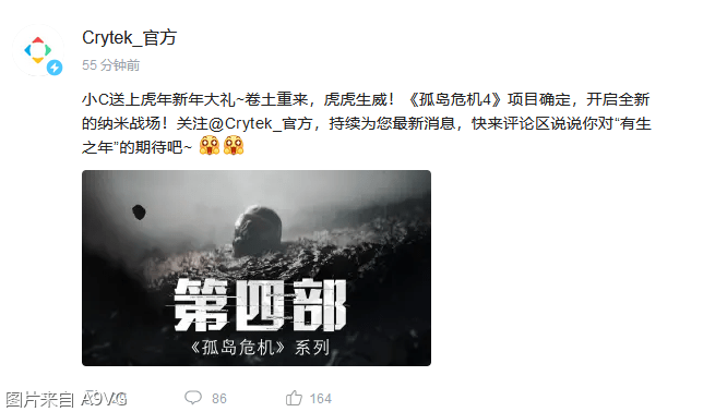 Crytek B站账号发文宣布《孤岛危机4》已经立项,不过目前他们已经删除了这条动态。