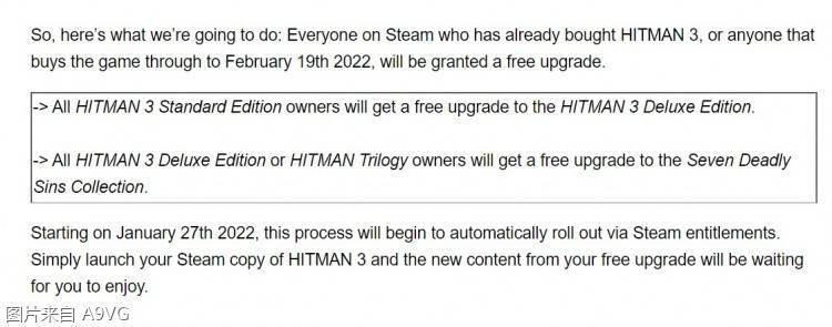 开发商IO Interactive今日宣布将针对《杀手3》Steam版的糟糕首发状况进行补偿,从今日起至2月19日,所有在Steam购买了《杀手3》普通版的用户可免费升级至豪华版,所有购买了豪华版或《杀手》三部曲的用户可免费升级至“七宗罪”合集版,玩家只需启动游戏就能访问对应的免费升级新内容。