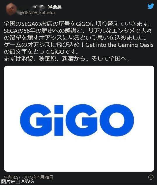 GiGO的意思是「进入游戏的绿洲=Get into the Gaming Oasis」,GENDA会长「片冈尚」表示,感谢世嘉街机厅这56年的历史,希望今后我们能成为绿洲,满足众人对于真实娱乐的渴求。