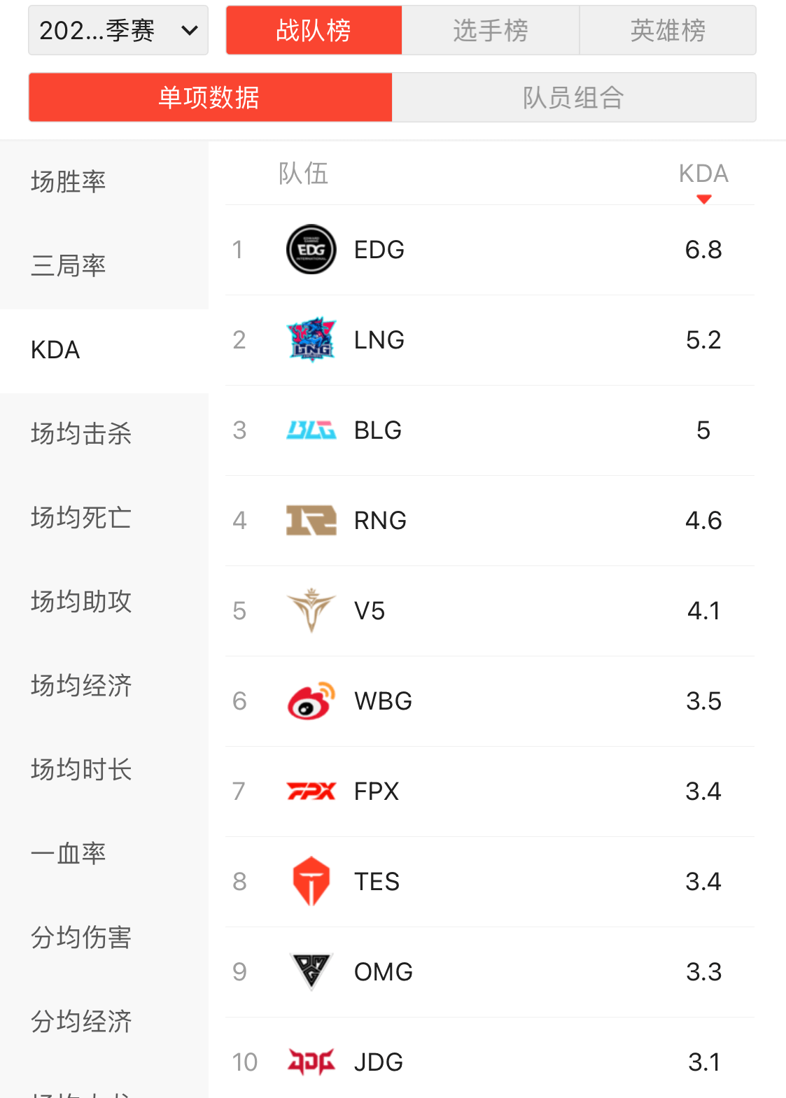 EDG第二项排名第一的数据为KDA,团队总KDA数据为6.8,领先第二名的LNG(5.2),第三和第四名分别是BLG和RNG。