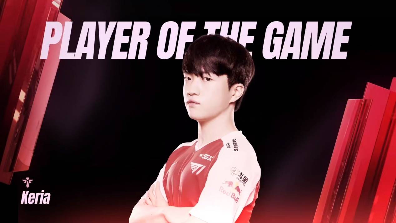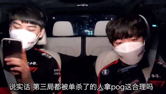 视频里面Gumayusi和Keria是在车里面聊天,拿着手机看粉丝评论,过程中Gumayusi来了一句:话说第三局被单杀的人拿了POG(就是MVP)真的合理吗?听到这句话之后Keria绷不住了,直接啊呜呜觉得很危险。