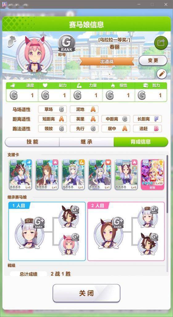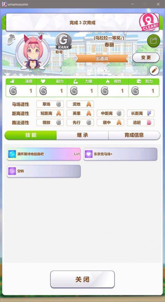 需要注意的是点的时候千万不要进行有黄金城的那项,不然大概率回光返照(bushi),剩下只需要一直失败把五维降到1就可以了,如果有余裕的话还可以去跑草地比赛,有概率获得对应场地紫技能,不过我这里失误了,错过了中山竞马场,只刷到了东京竞马场的技能,有马也用不上了,喜欢凹的朋友可以尝试一下。